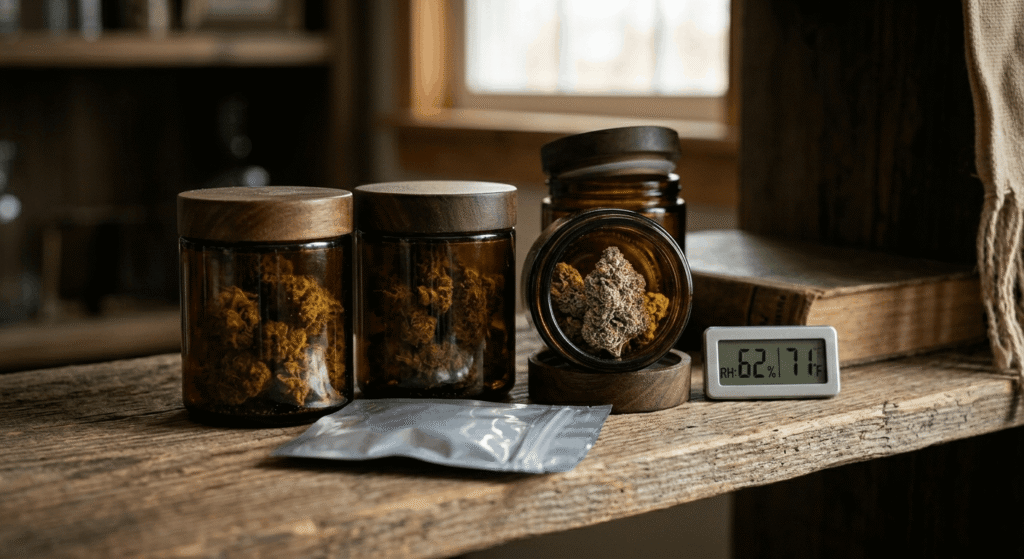 Flower stored in open or plastic containers at room temperature loses potency and may mold. Use airtight glass or mylar in a cool, dry space and monitor humidity to protect every investment.